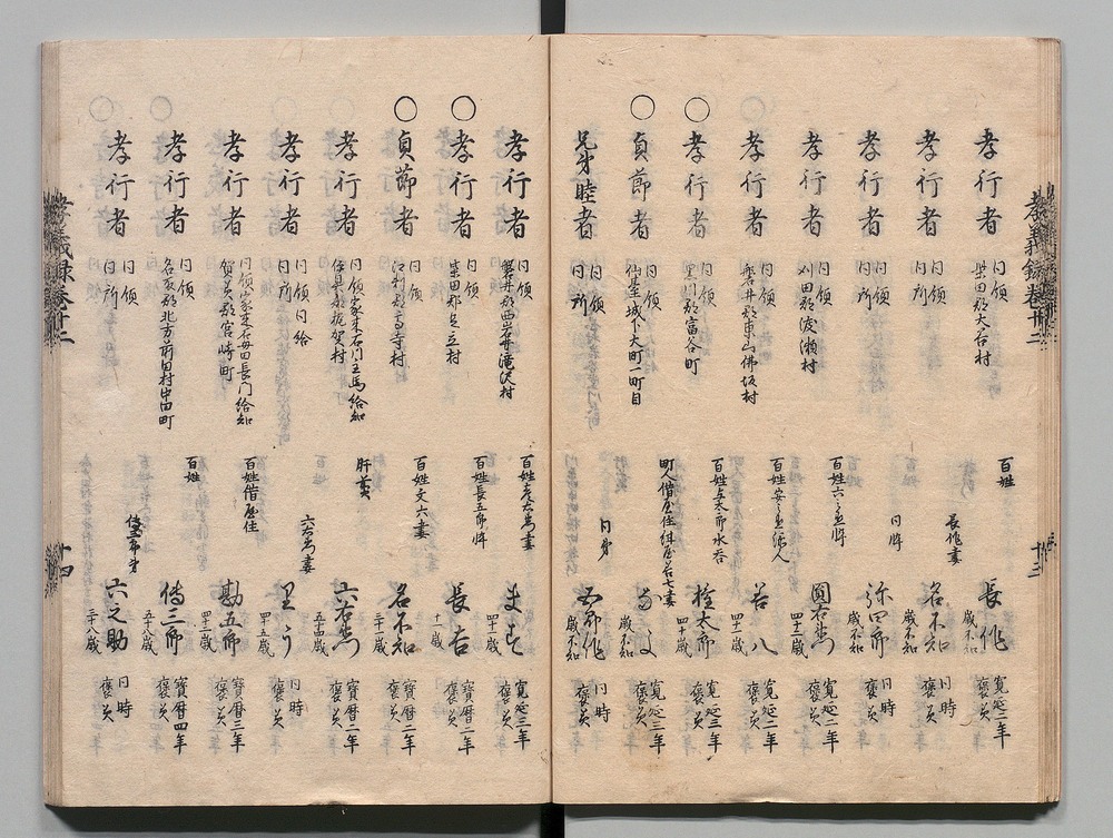 | 25 |  | 11200134 | 官刻孝義録 二十五 出羽 Kankoku Kōgiroku (Examples of Awards Given to People's Good Deeds, Published by the Tokugawa Shogunate), 25: Dewa | | 江戸後期 享和元年8月 1801 19世紀 | 22.5 cm x 15.8 cm |