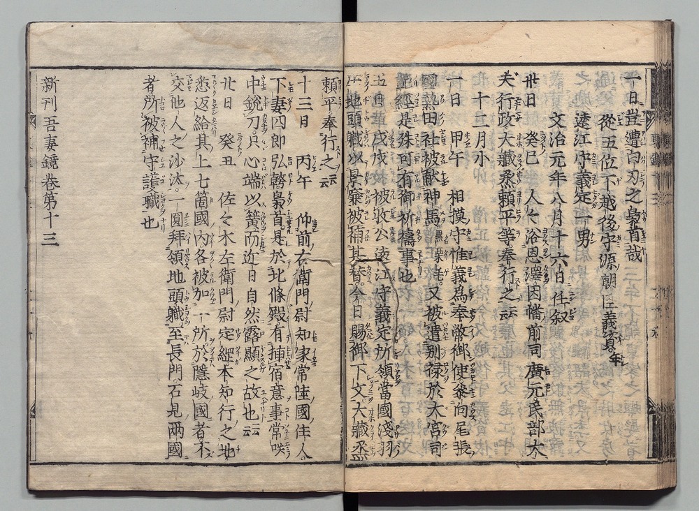 | 10 |  | 89201703 | 吾妻鏡 巻第十八・十九 Azuma Kagami (The Mirror of the East), Vols. 18 & 19 | | 江戸前期 寛文元年12月 1661 17世紀 | 26.9 cm x 19.7 cm |
