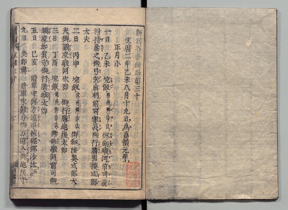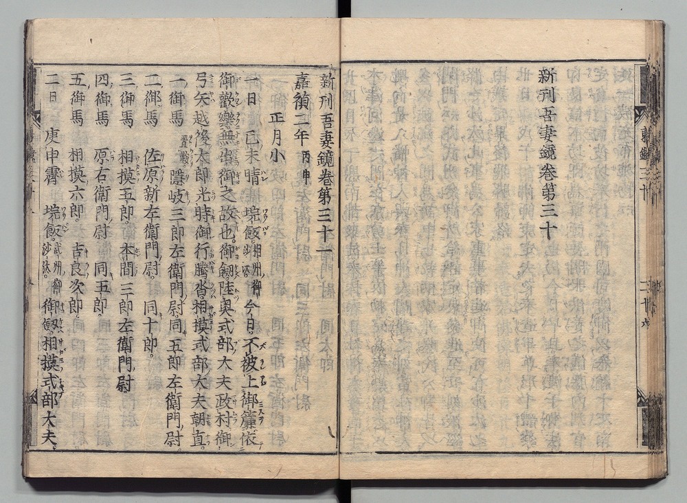 | 18 |  | 89201711 | 吾妻鏡 巻第三十四・三十五 Azuma Kagami (The Mirror of the East), Vols. 34 & 35 | | 江戸前期 寛文元年12月 1661 17世紀 | 26.9 cm x 19.7 cm |