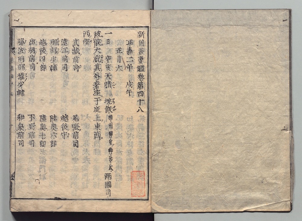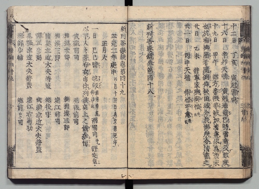 | 24 |  | 89201716 | 吾妻鏡 巻第四十六・四十七 Azuma Kagami (The Mirror of the East), Vols. 46 & 47 | | 江戸前期 寛文元年12月 1661 17世紀 | 26.9 cm x 19.7 cm |
