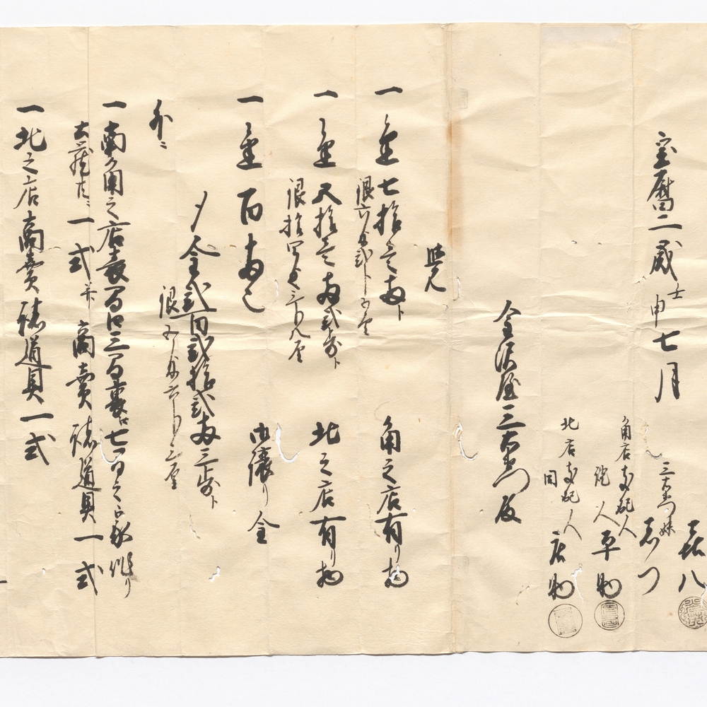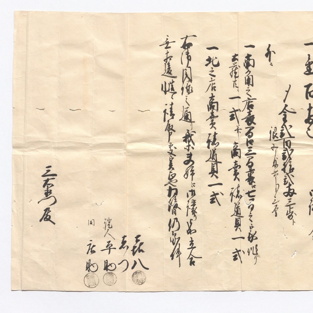 Creator - 弐ケ所出見世譲り主喜八 三右衛門妹しつ 角店支配人証人平助 北店支配人同庄助