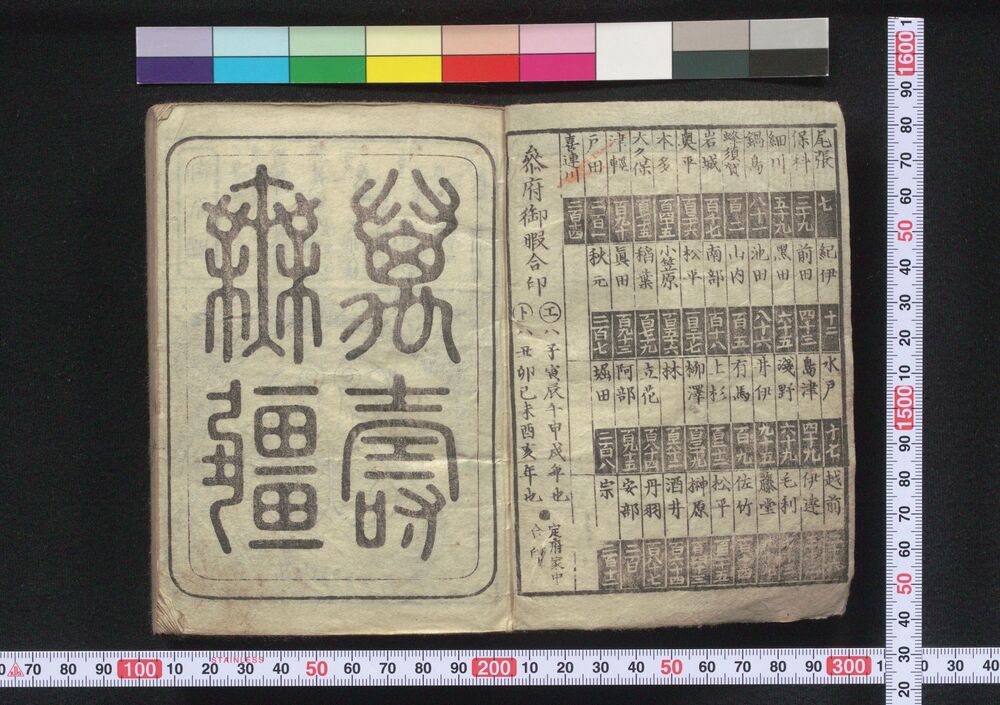 | 4 | ![]() | 88202882 | 泰平万代 大成武鑑 巻四 Taihei Bandai Taisei Bukan (Directory of Feudal Lords and Government Officials), Vol. 4 | 江戸後期 天保11年 1840 19世紀 | 15.1 cm x 11.0 cm |