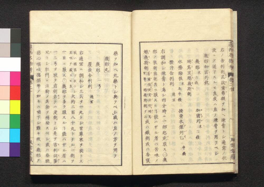 | 9 |  | 88208366 | 遠西醫方名物考 巻八 加下・與 Ensei Ihō Meibutsu Kō (Book of Western Medicines), Vol. 8 | 宇田川榛斎/訳 宇田川榕庵/校補 | 江戸後期 文政5年壬午仲秋 1822 19世紀 | 26.0 cm x 17.7 cm |