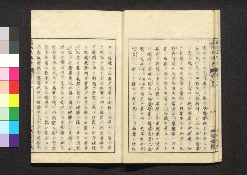 | 9 |  | 88208366 | 遠西醫方名物考 巻八 加下・與 Ensei Ihō Meibutsu Kō (Book of Western Medicines), Vol. 8 | 宇田川榛斎/訳 宇田川榕庵/校補 | 江戸後期 文政5年壬午仲秋 1822 19世紀 | 26.0 cm x 17.7 cm |