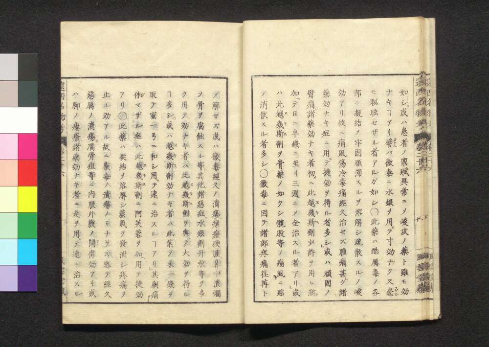 | 35 |  | 88208393 | 遠西醫方名物考 巻三十五 寸四 Ensei Ihō Meibutsu Kō (Book of Western Medicines), Vol. 35 | 宇田川榛斎/訳 宇田川榕庵/校補 | 江戸後期 文政5年壬午仲秋 1822 19世紀 | 26.0 cm x 17.7 cm |