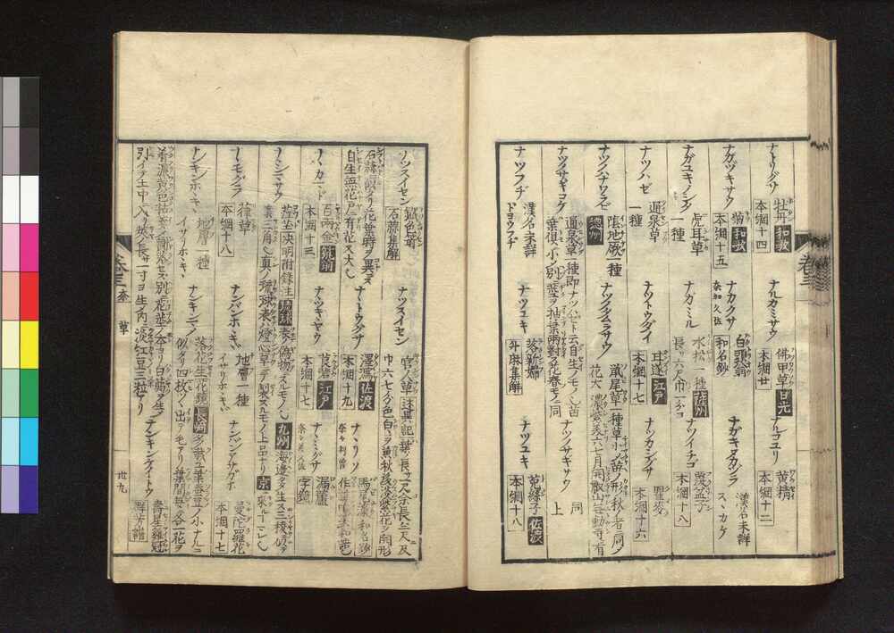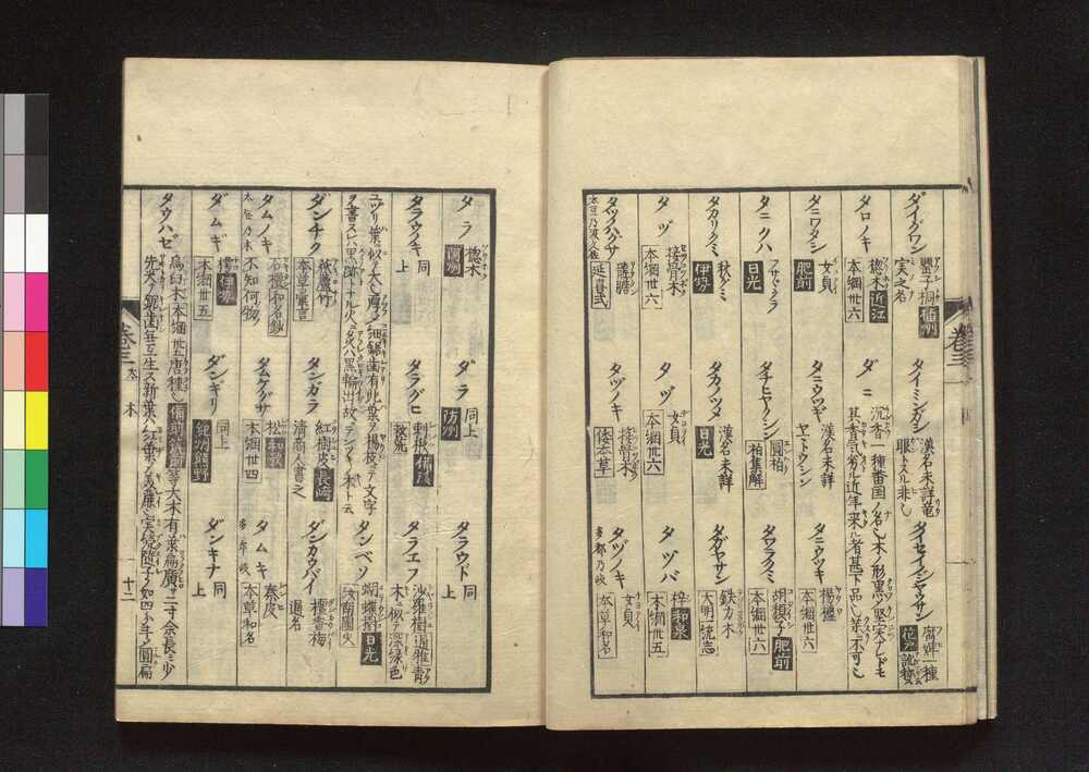 | 3 |  | 89204666 | 校訂 本草薬名備考和訓鈔 2 Kōtei Honsō Yakumyō Bikō Wakunshō (Dictionary of Medicine, Revised Edition) 2 | 丹波朝臣頼理/著 錦小路頼理/輯 紀府侍医山澄延年/校 | 江戸後期 天保2年3月 1831 19世紀 | 25.3 cm x 17.7 cm |