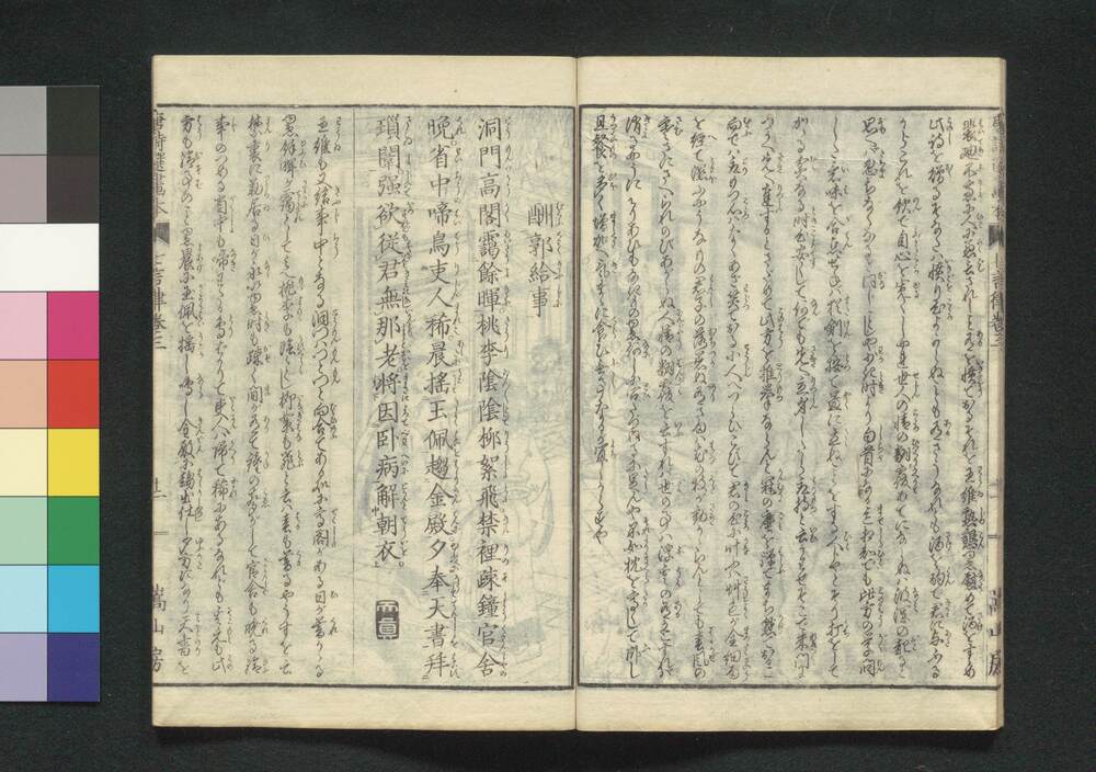 | 19 |  | 89210841 | 唐詩選画本 4編3:七言絶句続編 Toshisen Ehon (Illustrated Book of Poems of the Tang Dynasty), Vol. 4 (3): More Seven-character, Four-line Poems | 著者不明 北尾重政/画 | 江戸後期 寛政5年 1793 18世紀 | 22.7 cm x 16.0 cm |