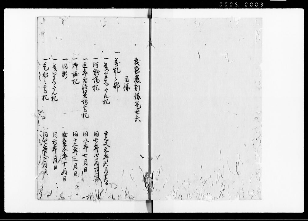 | 2 | ![]() | 90376883 | 厳制録 目録 Genseiroku, Table of Contents (Hand-copied Book of Laws) | [江戸時代] 17~19世紀 | 27.5cm x 18.5cm | |