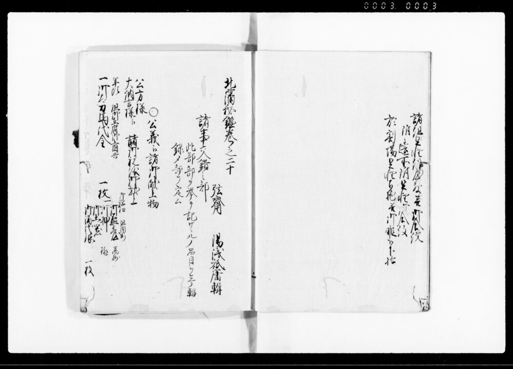 | 2 |  | 90377665 | 北藩秘鑑 自二至三 Hokuhan Hikan, Vol. 2 to Vol. 3 (Hand-copied Book of Laws) | 湯浅祇庸(弦斎)/著 | [江戸時代] 17~19世紀 | 23.5cm x 17.2cm |