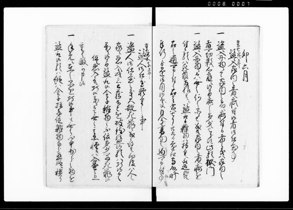 | 3 | ![]() | 90378340 | 公裁秘録 七 Kōsai Hiroku Vol. 7 (Hand-copied Book of Laws) | [江戸時代] 17~19世紀 | 25.8cm x 18.8cm | |