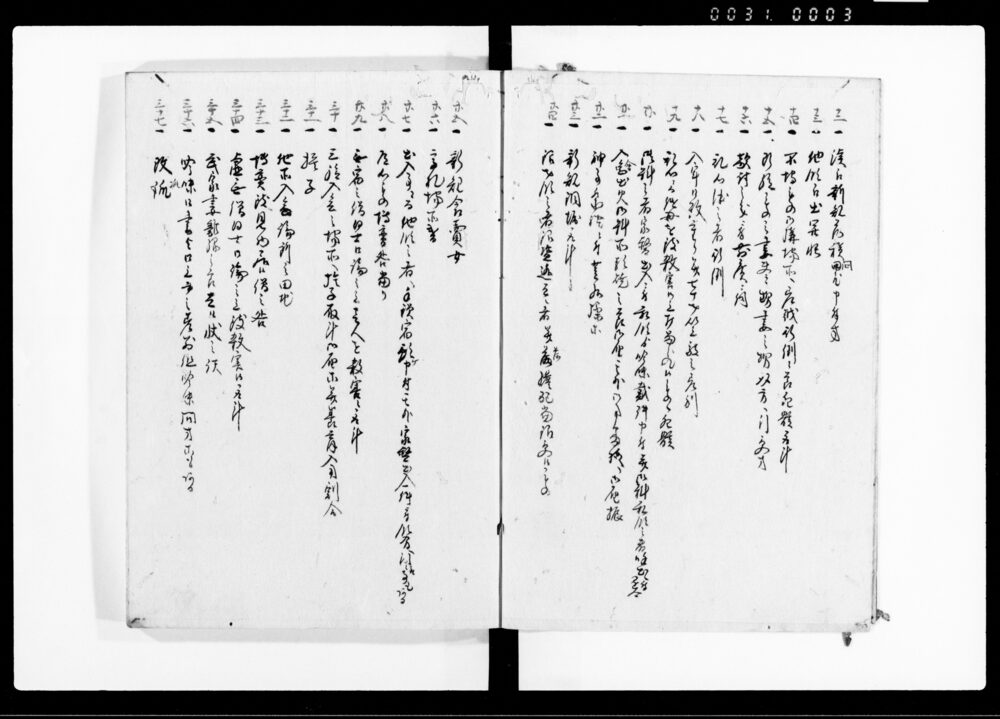 | 3 | ![]() | 90378460 | 三庁秘録 十七 十八 十九 Sanchō Hiroku, Vol. 17, Vol. 18, Vol. 19 (Collection of Inquiries and Directives between the Three Magistrates’ Offices and the Shōgunate) | [江戸時代] 17~19世紀 | 25.7cm x 19.3cm |