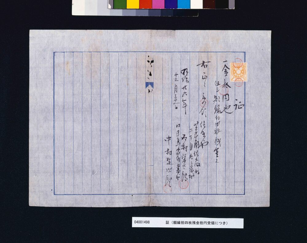 | 13 | ![]() | 04001494 | 証(額縁14枚代金受取) Certificate (Receipt of Payment for Fourteen Frames) | 石村栄太郎,中村定二郎,川村清雄 | 明治中期 明治25年9月3日 1891 19世紀 | 24.4 cm x 33.0 cm |