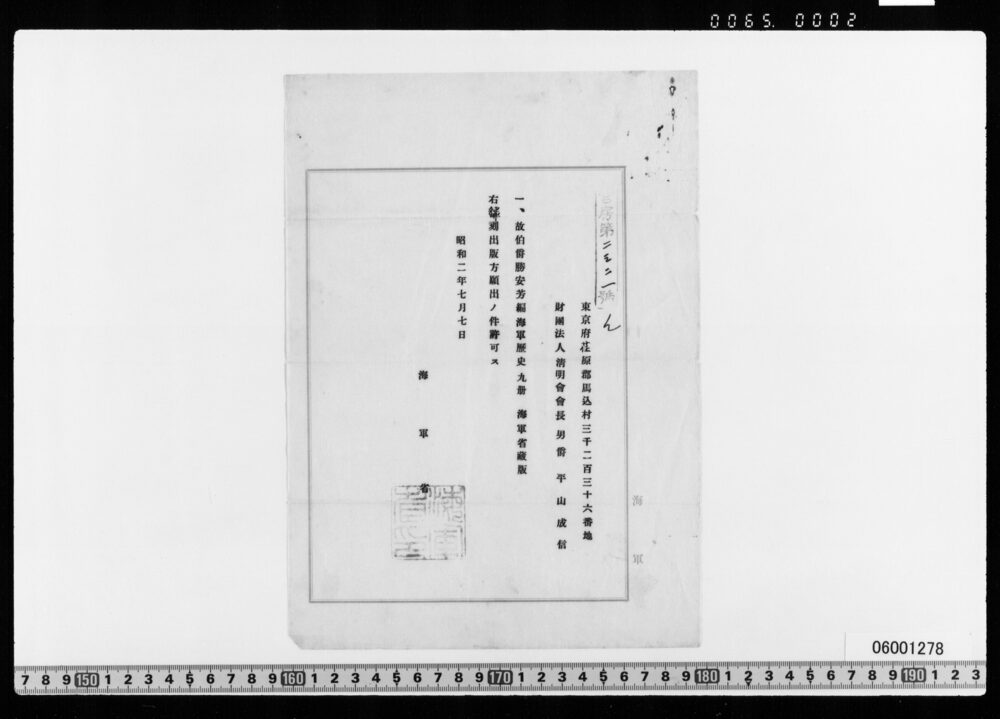 海軍省蔵版海軍歴史翻刻出版許可証