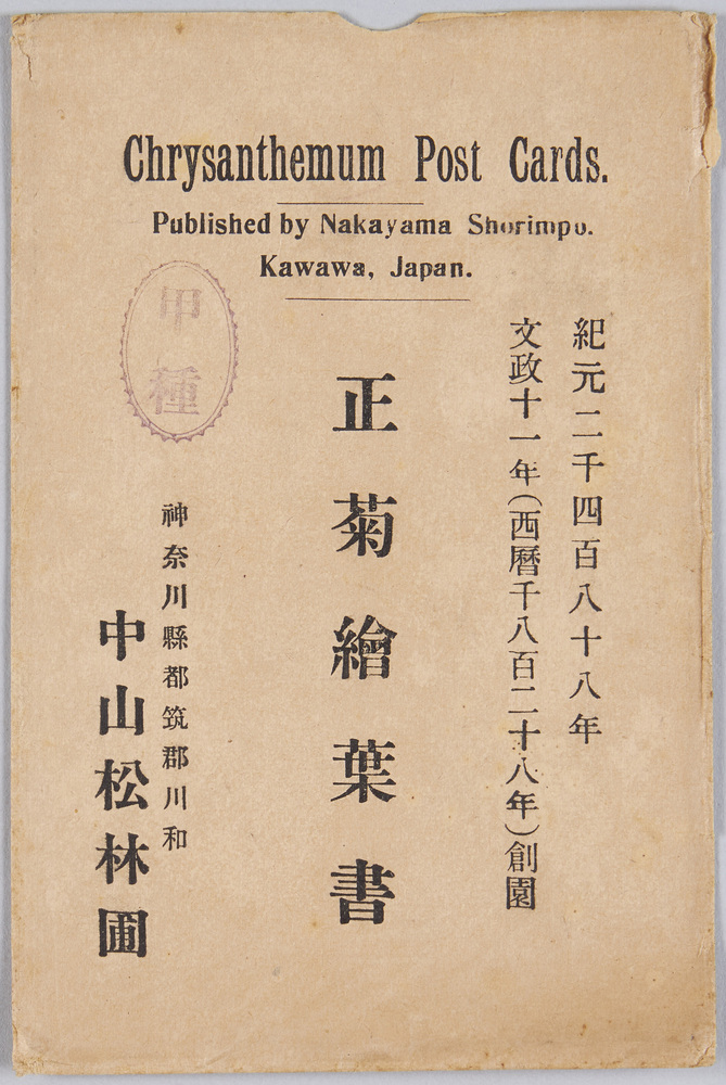 | 1 | ![]() | 91007587 | 中山松林圃 正菊絵葉書 袋 Envelope for Picture Postcards of Chrysanthemums, Nakayama Shōrimpo Chrysanthemum Gardens | 近代 20世紀 | 14.5 cm x 9.6 cm | |