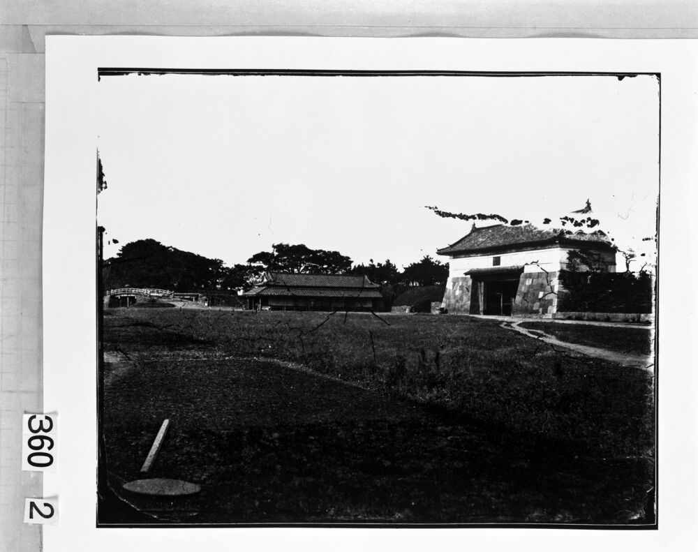 - 1871年(明治4)に撮影された旧江戸城の写真のネガ原板。江戸城は幕末から荒廃が始まり、明治維新後は江戸時代の面影を失っていった。当時の太政官少史蜷川式胤(にながわのりたね)はその姿を目にし、写真で記録しようと太政官の許可を得て写真師横山松三郎に撮影を命じた。当時の写真はガラス板に感光剤を塗り、乾かないうちに撮影、現像するコロディオン湿板法。ネガには多くの修正が加えられ、空の部分には紙が貼られたり、黒く塗られたりしているものが多い。これはネガの画像を印画紙に焼き付ける際、空の部分に紙を貼り付け、建物と空との境界線を黒く塗りつぶしておくことで、空を白く、建物の形を明確に表現するためであった。
