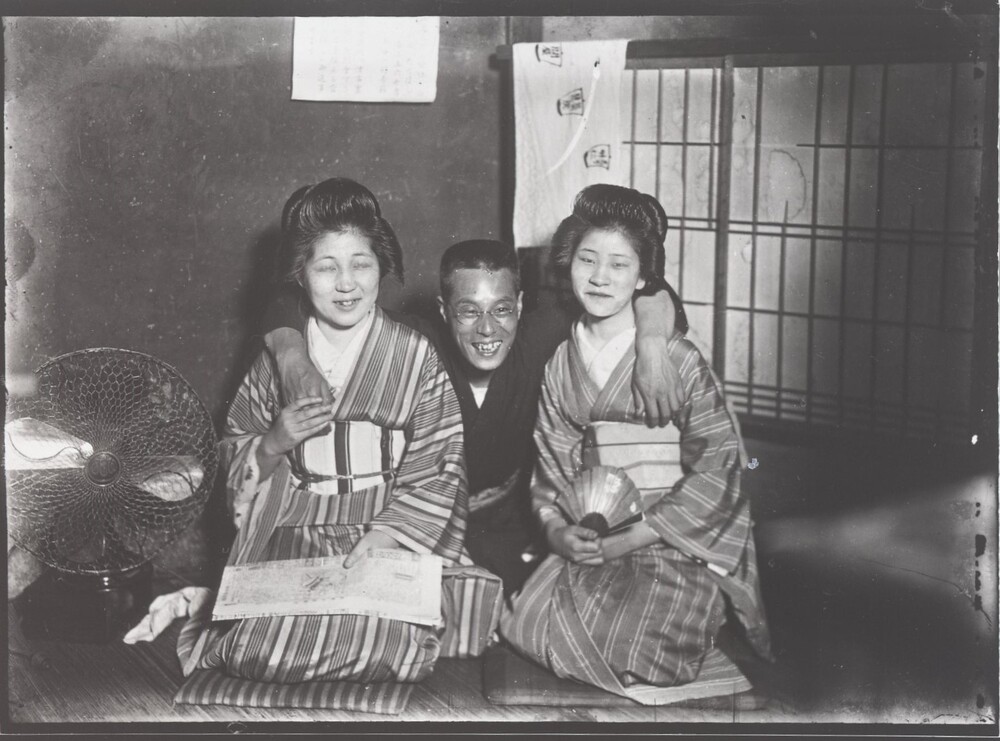 男性と2人の芸者